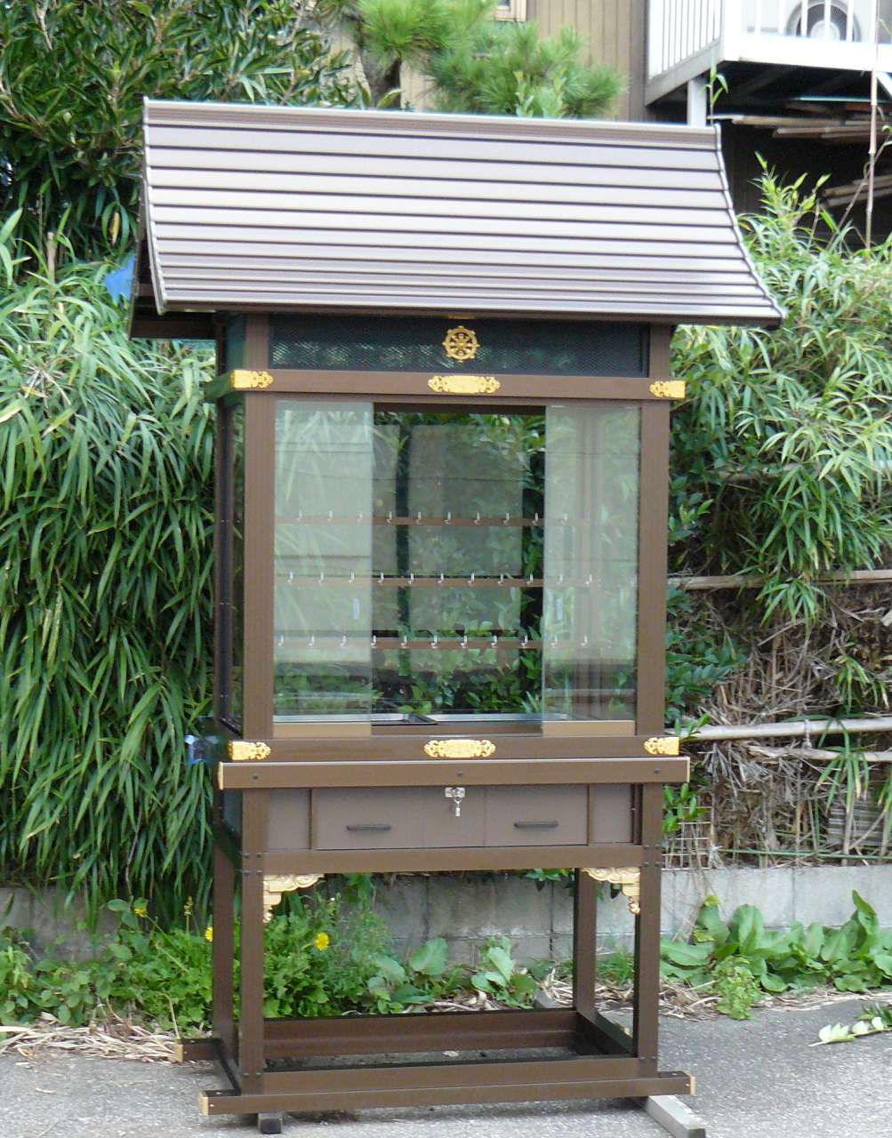 お寺様や神社など、寺社仏閣に設置されている絵馬掛けや手桶棚、提灯掛け、掲示板、梵鐘や香炉台、納骨壇、銅像など。